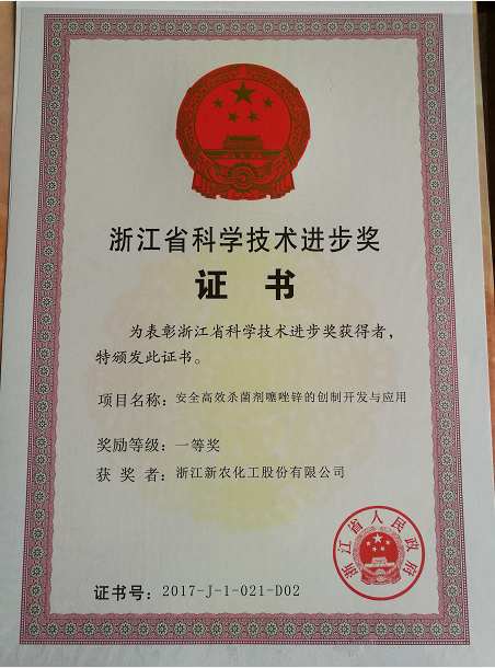 公司产品噻唑锌荣膺浙江省科技进步一等奖